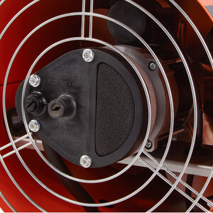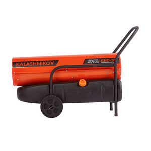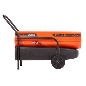 Дизельная тепловая пушка Kalashnikov KHD-50 – это мощный обогреватель, работающий на дизельном топливе. Предназначена для обогрева нежилых помещений и локального прогрева рабочих поверхностей. Высокий уровень КПД прибора близок к 100%, а тепловая мощность 50 кВт, производимая тепловой пушкой – вполне достаточна для использования устройства в качестве мощного генератора тепла. Воздушный поток при помощи вентилятора втягивается внутрь корпуса через защитную решётку в основании пушки и проходит через камеру сгорания, где смешивается с распылённым под высоким давлением дизельным топливом, подающимся из топливного бака в форсунку. В камере сгорания воздушно – топливная смесь поджигается при помощи трансформаторной системы розжига с высокопроизводительными 12 кV электродами, и выбрасывается в обогреваемое помещение вместе с продуктами сгорания. Теплоотражающий стальной экран в передней торцевой части корпуса задерживает открытое пламя и не даёт ему вырываться наружу, тем самым обеспечивая равномерный нагрев помещения, либо рабочей поверхности.