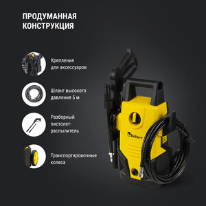 Функция самовсасывания – специальная конструкция насоса обеспечивает стабильный напор даже при минимальном давлении воды на входе мойки. Функция Auto Stop – мотор останавливается автоматически при отжатой спусковой кнопке пистолета. Разборный пистолет-распылитель – для удобства транспортировки мойки. Шланг высокого давления 5 м – позволяет значительно увеличить радиус обрабатываемой поверхности. Крепления для аксессуаров на задней панели мойки – обеспечивают удобство в работе и транспортировке. Регулировка распылителя – позволяет изменить форму струи с мощной струи без распыления до веерного распыления под углом до 60 градусов. Емкость для моющих средств – использование моющих средств сокращает время очистки и способствует устранению сильных загрязнений. Транспортировочные колеса – удобны для комфортного использования и перемещения. Гарантийный срок эксплуатации на изделие составляет 2 года.