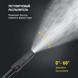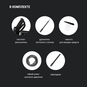 пистолет-распылитель – 1 шт., удлинитель пистолета с соплом – 1 шт., гибкий шланг высокого давления – 1 шт., емкость для моющих средств – 1 шт., переходник – 1 шт.