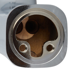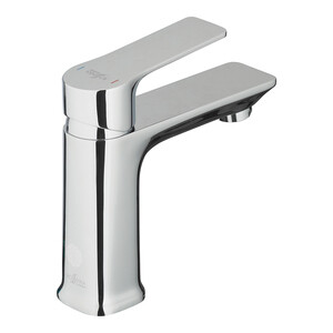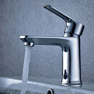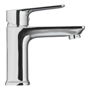 Смеситель для раковины выполнен из латуни. Поверхность смесителя гладкая с глянцевым блеском.