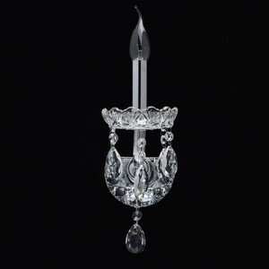 Классическая форма свечи для интерьеров в традиционном стиле. Основание из стекла с алмазной гранью украшает корпус и розетку светильника затейливым узором. Хрустальный декор подвесок создают игру света. Основание бра выполнено из металла и гальванизировано в цвет хрома. Рожок выполнен из стекла гутным способом. Основание декорировано прозрачным стеклом, отлитым в сложную форму. Светильник декорирован прозрачным хрусталем формы октагон и миндаль.