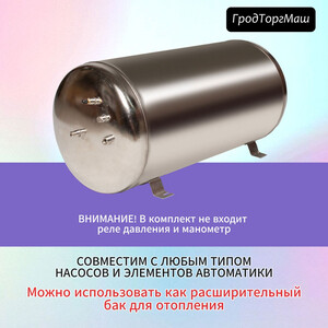 Гидроаккумулятору безмембранный ГА-50 (50 л) – автоматическое управление бытовыми электрическими насосами и формирование необходимого давления в сети при организации водоснабжения частных жилых объектов. Обеспечивает давление воды для установки электрических и газовых водонагревателей, автоматизированной стиральной машинки. Данное оборудование содержит водный резерв под давлением воздушной подушки. При помощи реле давления происходит систематическое включение и выключение насоса. Это позволяет поддерживать уровень оптимального давления в комплексе инженерных сооружений подачи воды здания в установленных границах. Он изготовлен в соответствии с системой проверки качества производителя ISO 9001. Изготовлен из нержавеющей стали (верхняя часть бака толщиной 1,2 мм, стальная пластина толщиной 1,5 мм для нижнего и верхнего дисковых элементов) с использованием самых современных инструментов, что не только отвечает гигиеническим требованиям, но и обеспечивает максимальную безопасность эксплуатации и длительный срок службы – более 25 лет.