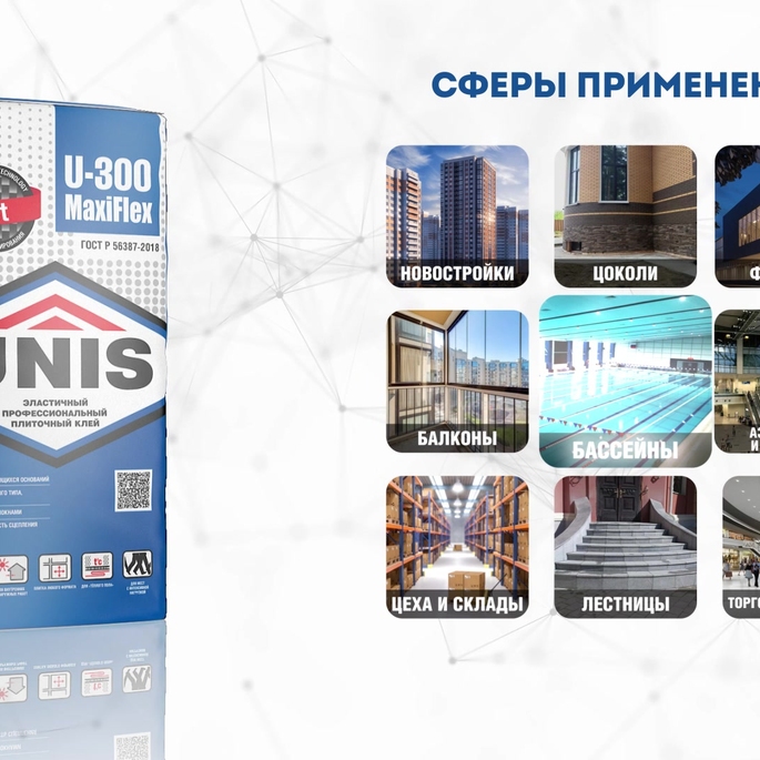 Профессиональный эластичный клей для укладки облицовочных плит любого формата из керамогранита (в т.ч. с размером грани плитки до 3 м), искусственного и натурального камня, клинкерной и керамической плитки. Применяется для внутренних и наружных работ при облицовке стен и полов в квартирах, магазинах, для облицовки фасадов, балконов, террас, цоколей и бассейнов. Подходит для поверхностей, подверженных деформационным нагрузкам – входные группы в здание, лестничные марши и площадки, промышленные цеха и складские зоны, паркинги, промышленные полы, ж/д вокзалы, подземные переходы, станции метро, аэропорты и т.д. Применяется для облицовки нагреваемых поверхностей – теплых полов, печей и каминов до +120°C. Усилен армирующими волокнами, вибростойкий, ударопрочный, для мест с интенсивными нагрузками и температурными перепадами, эластичный, для деформирующихся оснований, для укладки плитки на гидроизоляцию. Применяется по бетонным и цементно-песчаным недеформирующимся основаниям, возрастом не менее 28 суток.