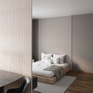 - 1. Зонирование. В больших комнатах с помощью реек можно отгородить различные зоны – обеденную и "диванную" – в кухне-гостиной, работы и отдыха – в совмещенной с домашним офисом спальне и так далее. Особенно это решение пригодится в компактных квартирах-студиях. С его помощью можно обозначить в общем пространстве жилища уединенную зону спальни, при этом не лишив ее естественного освещения.