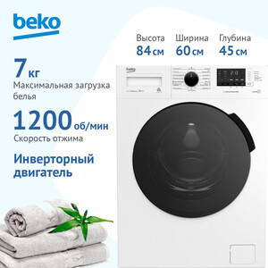 Стиральная машина Beko с габаритами 84x60x49 см имеет 15 программ стирки и максимальную загрузку 7 кг. Скорость отжима – 1200 об/мин, отсрочка старта, контроль дисбаланса, контроль пенообразования, обработка паром. В функционале присутствует возможность удаления шерсти животных, блокировка кнопок (защита от детей). Технология SteamCure отстирает даже пятна от травы, красок и сладостей на одежде. Использование пара перед началом стирки размягчает въевшиеся загрязнения, а подача пара в конце цикла уменьшает количество складок на вещах и экономит время на глажку утюгом. Нагревательный элемент Hi-Tech с никелированным покрытием защитит стиральную машину от образования накипи и ржавчины. Для снижения уровня шума, а также экономного энергопотребления в машинке установлен инверторный мотор ProSmart.