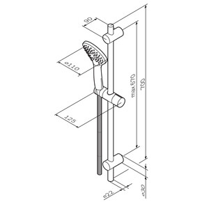 Штанга, душевая лейка, держатель лейки, шланг, набор креплений, инструкция.