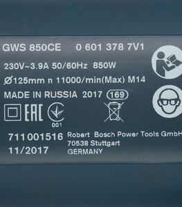 GWS 850 – модель угловой шлифмашины, C – поддержание числа оборотов на постоянном уровне, E – наличие электроники управляющей числом оборотов, 850 Вт – мощность, 125 мм – диаметр диска.