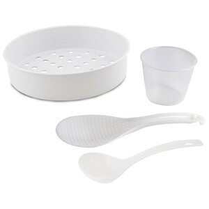 Столовая ложка, плоская ложка, мерная чашка, контейнер-пароварка, книга рецептов.