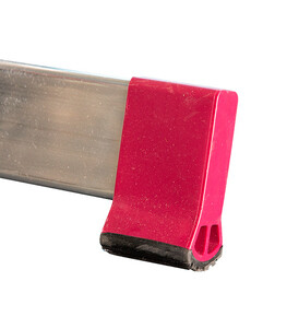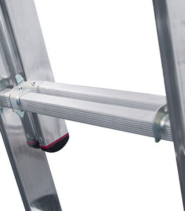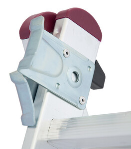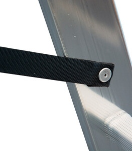 - имеет стальные широкие скобы, обеспечивающие плотный зажим выносных секций и прочные страховочные стяжки, предохраняющие лестницу от самопроизвольного раскладывания.