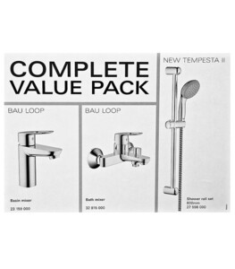 смеситель для умывальника Grohe BauLoop 23159000, смеситель для ванны/душа Grohe BauLoop 32815000, душевой гарнитур Grohe Tempesta II 600 мм 27598000.