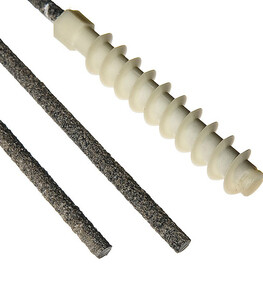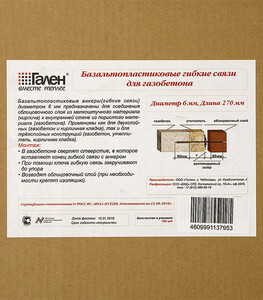 Базальтопластиковая гибкая связь для газобетона представляет собой стержень круглого сечения диаметром 6 мм с песчаным покрытием и специальной анкерной гильзой. Песчаное покрытие обеспечивают адгезию со строительным раствором и дополнительную защиту поверхности от коррозии в щелочной среде бетона. Для создания воздушного зазора применяется защелкивающийся фиксатор из ударопрочного и морозостойкого полипропилена. Фиксатор комплектуется отдельно. В среднем, на один кв. м. стены требуется не менее 5 изделий. Диаметр 6 мм, длина 270 мм.