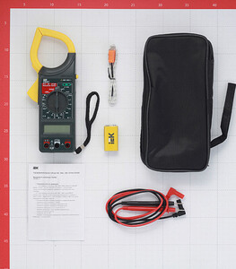 токовые клещи, тестовые щупы, батарейка 9В, сумка-переноска, паспорт, упаковочная коробка.