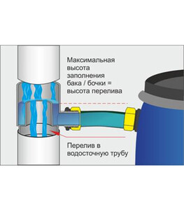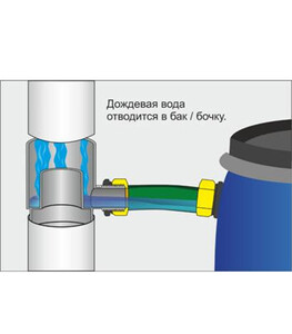 - В основе работы водосборника лежит принцип сообщающихся сосудов. Водосборник устанавливаемый на водосточной трубе, соединяется с емкостью для сбора дождевой воды (бочкой, баком) при помощи шланга. Вода стекает по шлангу в емкость до тех пор, пока уровень воды не достигнет максимальной высоты заполнения емкости (высоты перелива). Как только этот уровень достигнут, вода начинает поступать обратно в водосточную систему труб.