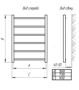 высота 730 мм (от края до края, без соединений), ширина 532 мм (от края до края, без соединений), межосевое расстояние 500 мм.