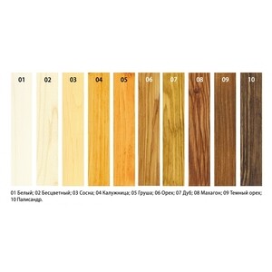 Обработанная поверхность полугляцевая шелковистая. Интенсивность цвета зависит от количества слоёв, вида, исходного цвета обрабатываемой поверхности. Состав проявляет естественную текстуру древесины.