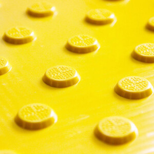 Тактильная плитка выполнена в соответствии с ГОСТ Р 52875-2018, изготовлена из высококачественного полиуретана или ПВХ, твёрдостью не более 85 единиц по Шору по таблице А. Материал является высокопрочным и невосприимчивым к перепадам температур, обладает относительными грязеотталкивающими свойствами, поэтому плитка отлично подходит для укладки как внутри, так и снаружи помещений. Тактильная плитка информирует человека с нарушениями зрения о преодолимом препятствии на пути следования (дверной проём, лестница). Для обеспечения контраста с подстилающей поверхностью, а также для обеспечения оптимальных условий восприятия цвета слабовидящим человеком, тактильная плитка имеет яркий цвет поверхности (из коллекции RAL). Плитка предназначена для монтажа при помощи клея уже на имеющиеся напольное покрытие